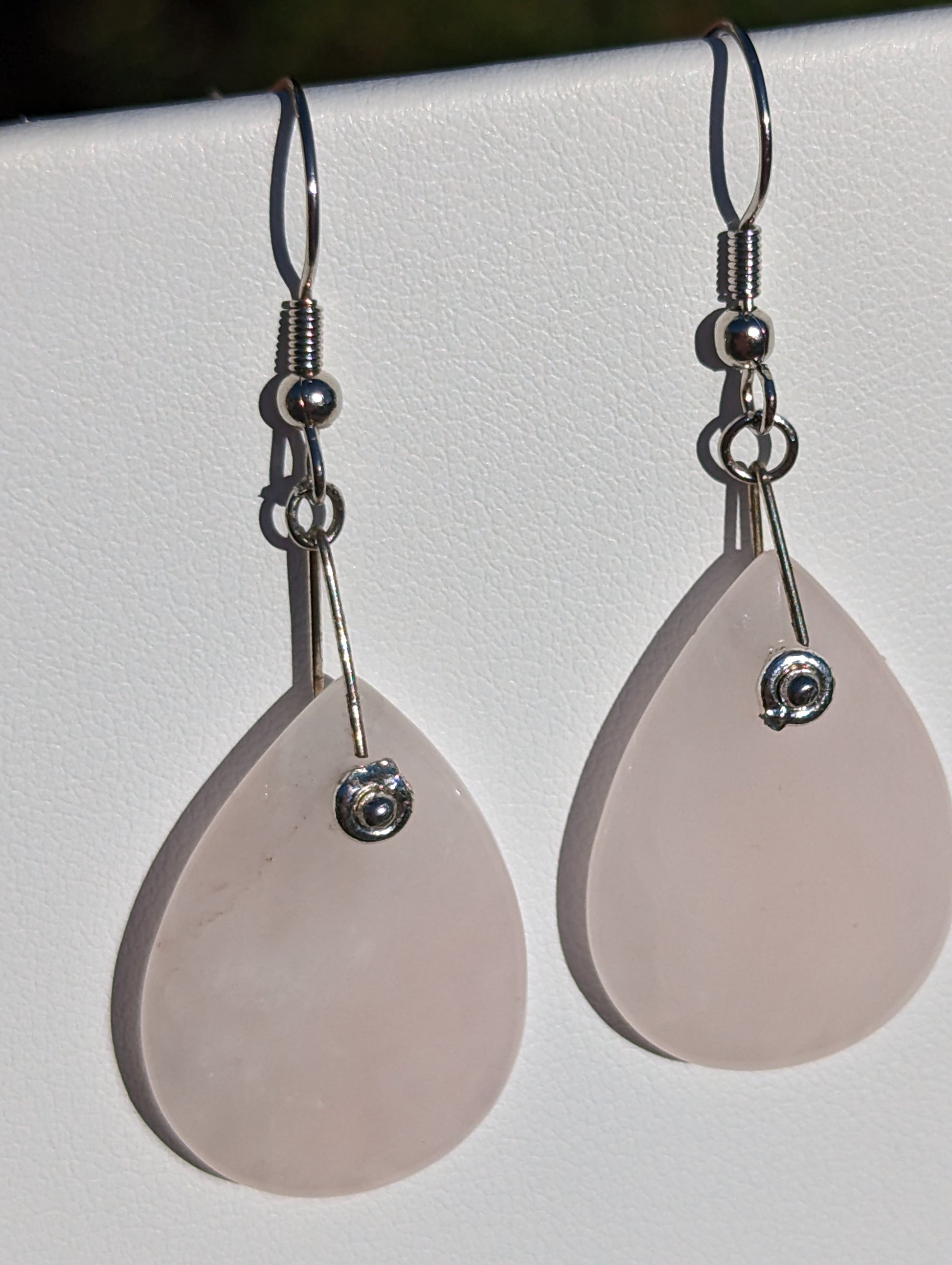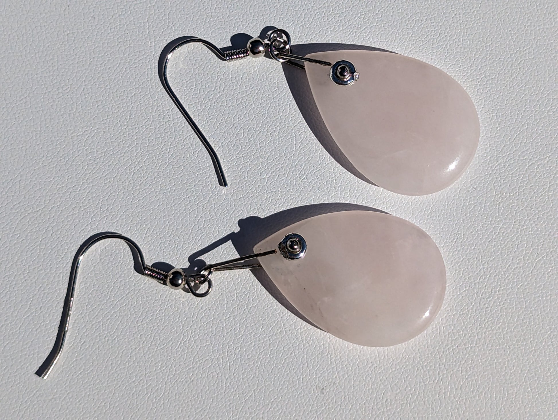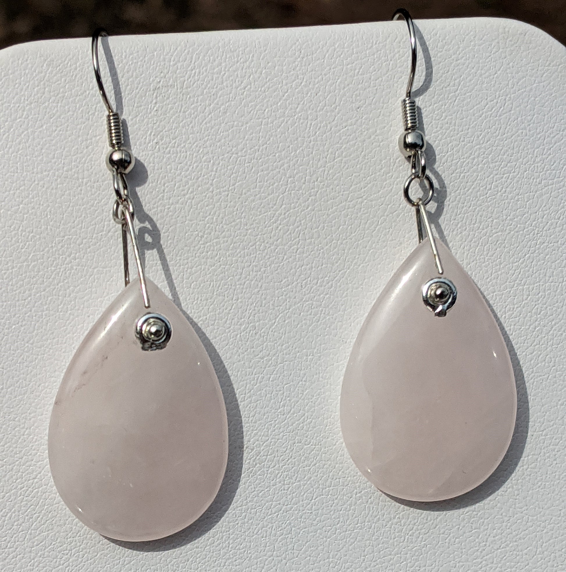 Rose quartz is the stone of unconditional love for self and others. Without hook, earrings measure 1.25 inches long and 1 inch wide. Silver-tone fishhook earrings include silicon earring backs.